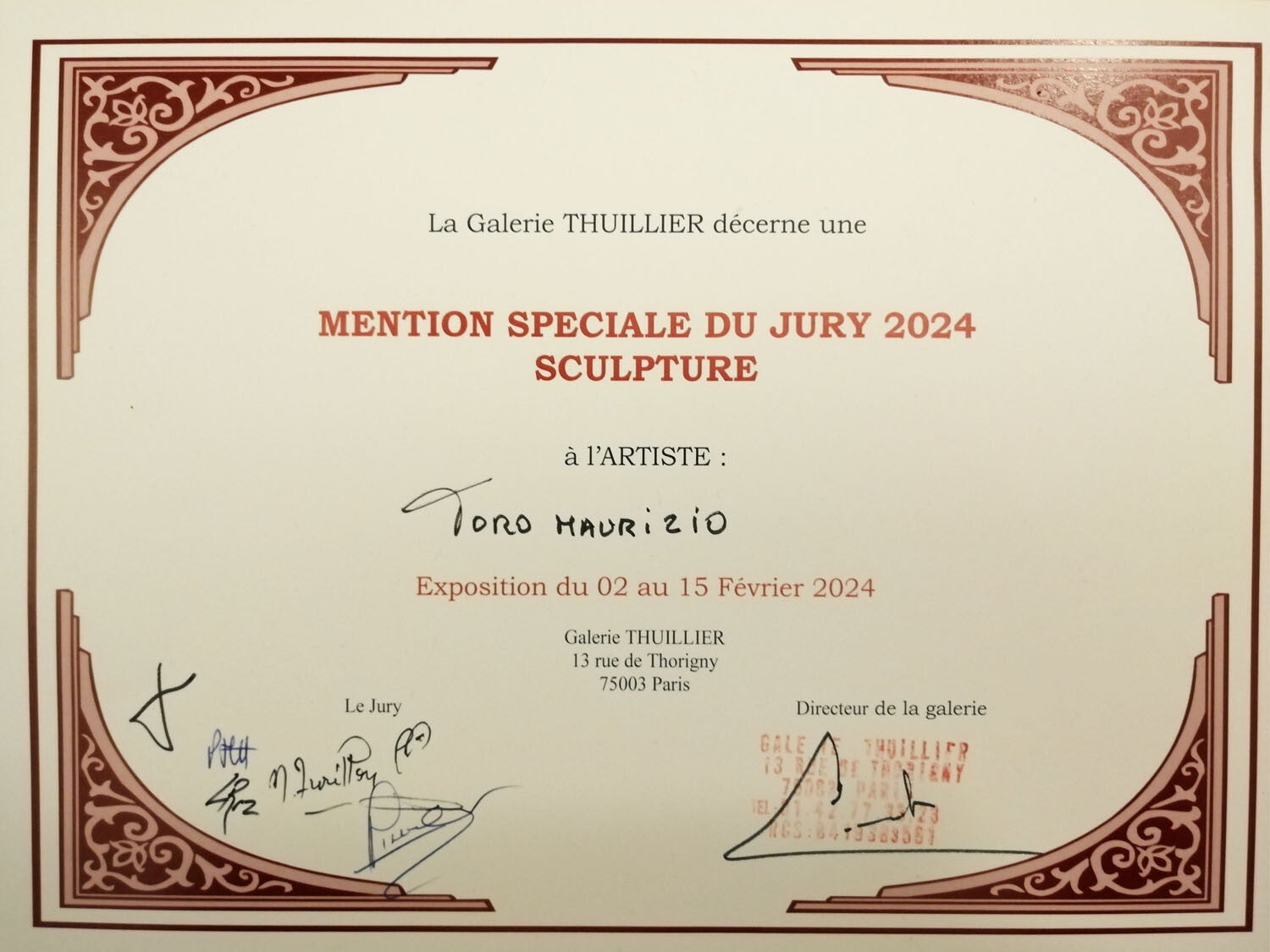 Membre honoraire de l'académie des Sciences Arts et Lettres de Paris 2024 - Diplomé et médaille de Bronze 2024 en sculpture